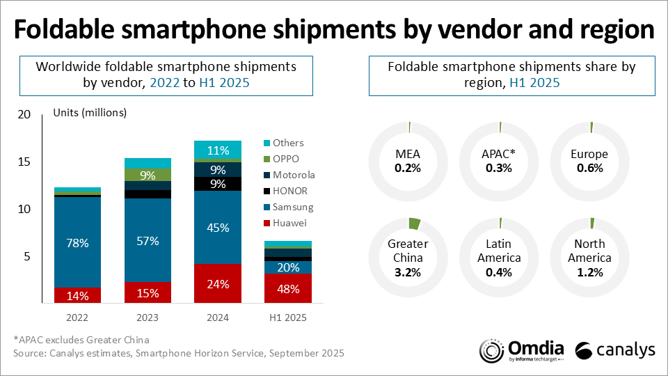 尽管该品类更加拥挤,但 2025 年上半年全球出货量持平于 660 万辆。中国是主要例外,同比增长 32.8%,主要由华为的 Mate 和 Pura X 机型推动。第二大可折叠市场美国在 7 年上半年小幅增长 2025%,主要受摩托罗拉 Razr 2025 系列的推动。