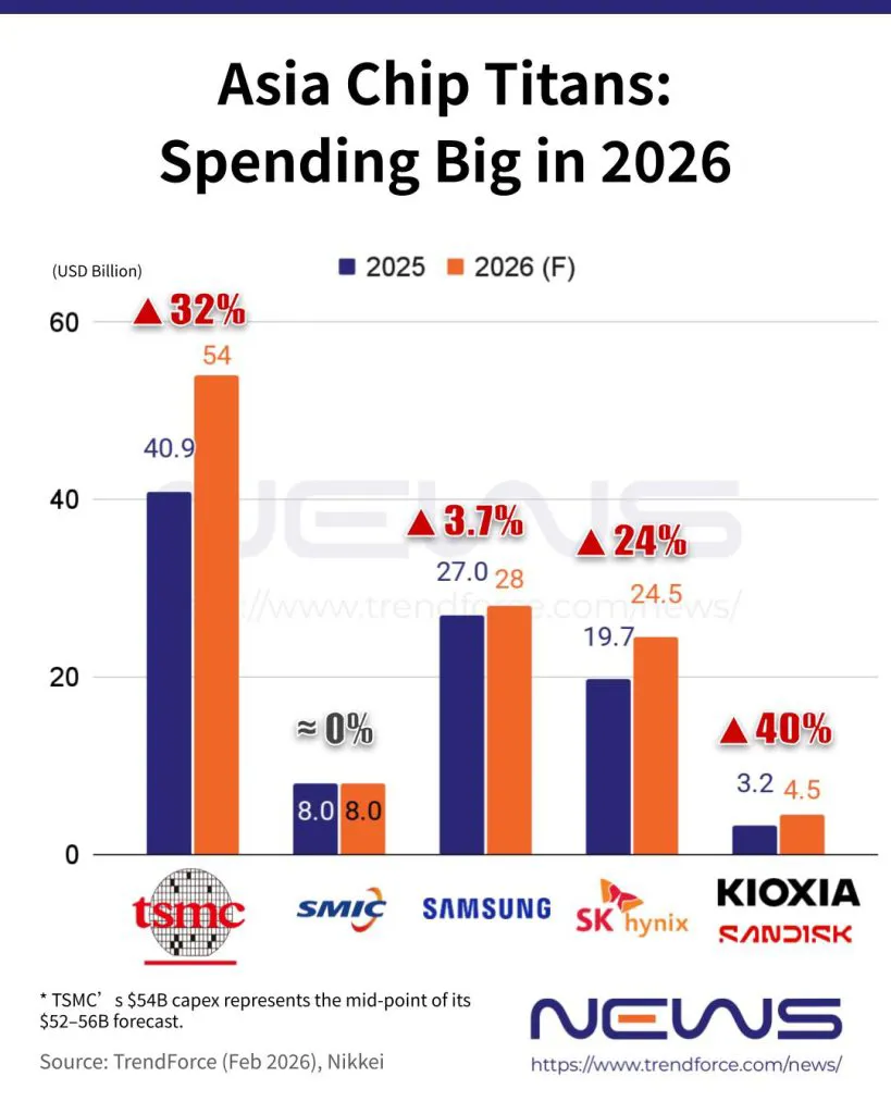 亚洲的代工厂领导者和主要记忆公司正在大幅加大2026年的投资。正如《商业时报》和中央新闻社此前报道,台积电今年计划创纪录的520至560亿美元资本支出,增长27%至37%,其中70%至80%专注于先进工艺,其余用于专业节点和先进包装。