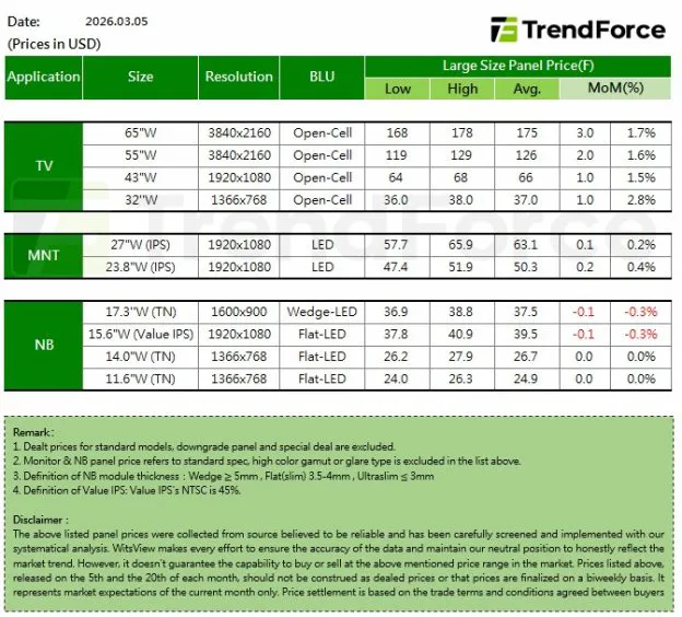 进入三月,电视需求保持稳定。北美分销商最近同意从第二季度开始提高小尺寸和中尺寸电视的零售价,这增强了电视品牌增加面板采购的信心。随着需求保持稳定,面板制造商也旨在维持电视面板价格的上涨势头。预计三月份,32英寸、43英寸和50英寸面板的价格将上涨1美元,55英寸面板上涨2美元,65英寸和75英寸面板上涨3美元。