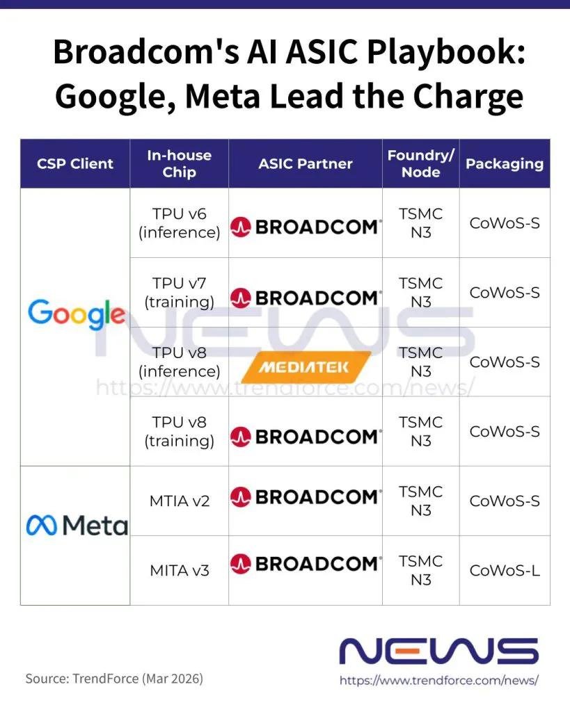 TrendForce预测,基于 ASIC 的 AI 服务器到 2026 年将占据市场 27.8%的份额,这是自 2023 年以来的最高份额,由谷歌和 Meta 等北美巨头扩大其内部 ASIC 项目推动。随着北美五大云服务提供商——谷歌、AWS、Meta、微软和甲骨文——预计在 2026 年资本支出同比增长 40%,博通可能成为 AI 基础设施繁荣的关键受益者。